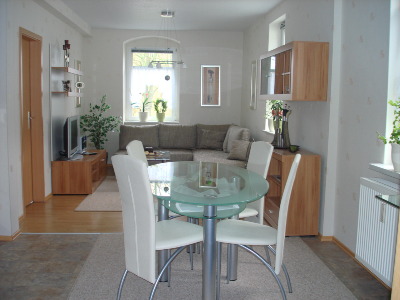 Der Essplatz bietet Platz für vier Personen.Die Eckcouch im Wohnzimmer kann als Schlafmöglichkeit für zwei Personen genutzt werden ( Liegefläche 1,20m).Vom Wohnzimmerfenster aus blicken Sie direkt auf die Helme.